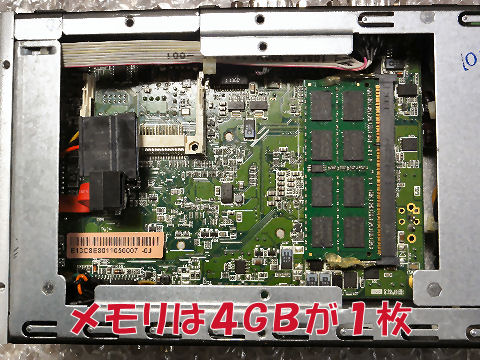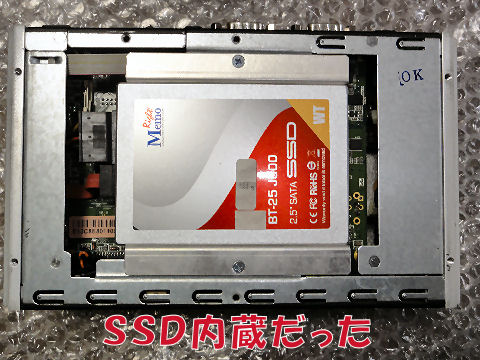 なんと32GBのSSDが残っていた(中身は某タイヤメーカのテストシステムだった、消去)、メモリは4GBが着いたまま。 両方とも振動でズレないようホットメルトで固定してあった、よく考えてある、さすがプロの仕事。 |