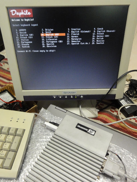 起動用のUSBメモリからブートしてDaphileを起動、問題なし。その後、システムを内蔵SSDへインストール、WEBサイトから最新版に アップデートして完了。 CPUはAtomのD525なので1UラックサイズPCの330よリは高性能、といってもたかが知れているが。 |