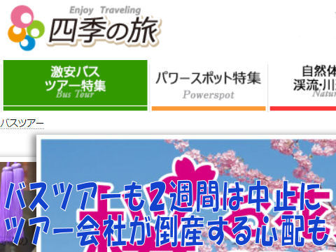 何度か利用した新宿発の格安バスツアー会社よりメールでこの先2週間のツアーは全部中止にするとの連絡が来た。 半月売り上げが無くなり経営が傾く心配も、ツアーガイドの人は無収入になって大変そう。 |