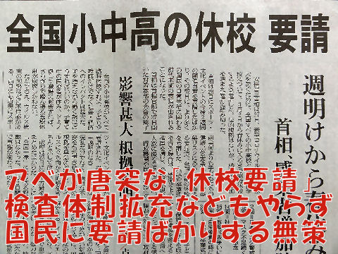 「一斉休校」の影響への配慮も無く、結局は「勝手に工夫しろ、影響が出るのは工夫が足らないから」と言い訳する ための方針変更?「影響への責任はとる」との発言はもう嘘になった? |