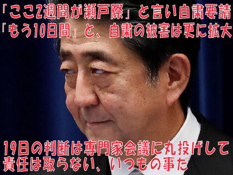 花見自粛という中での呑気に花見する無神経さ、国会で追及されると「公園でなくレストランの庭だ」と反論、 13人も集まって花見しているのは自粛方針に明らかに違反なのに。自分の配偶者もまともに制御できないアベ。 |