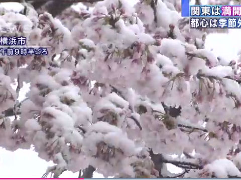 早朝は小雨だったが昼前には雪になり海岸に近い自宅でも積雪があったよう、最低気温は1℃近い冬のような天気。 |