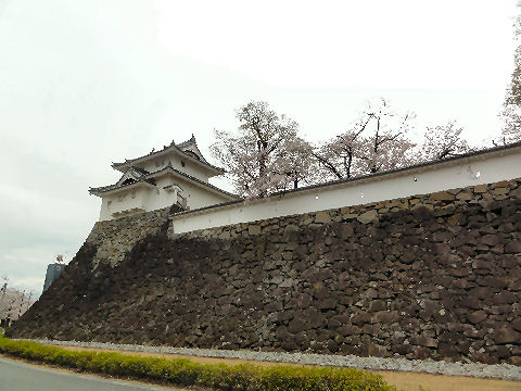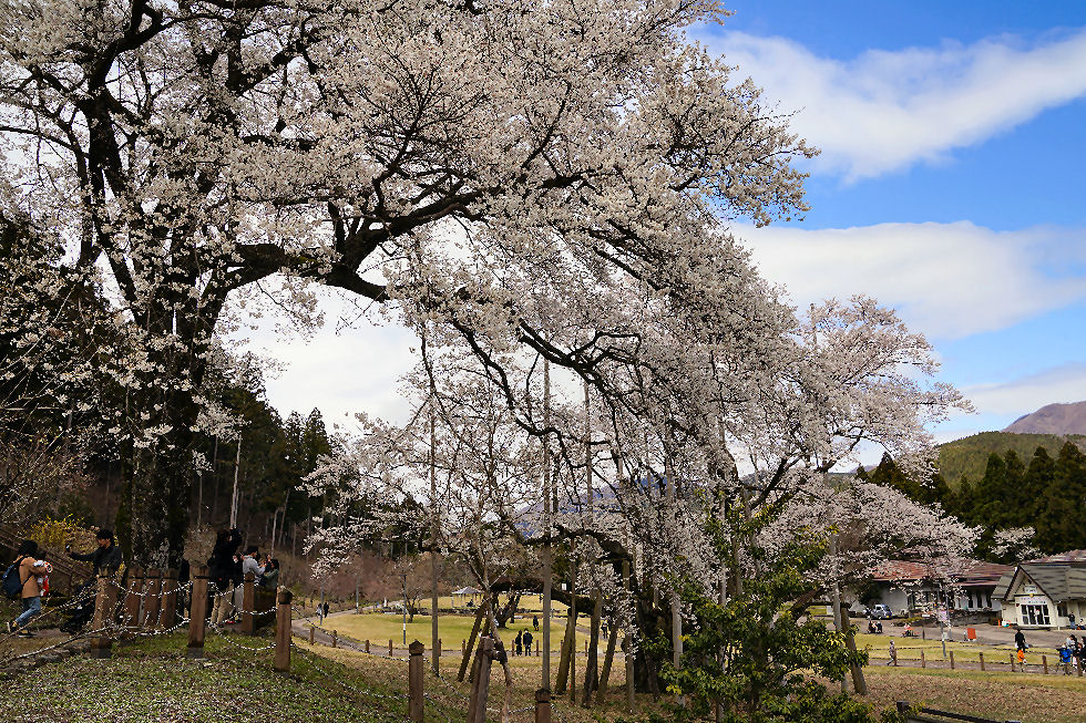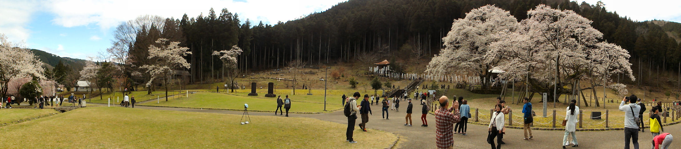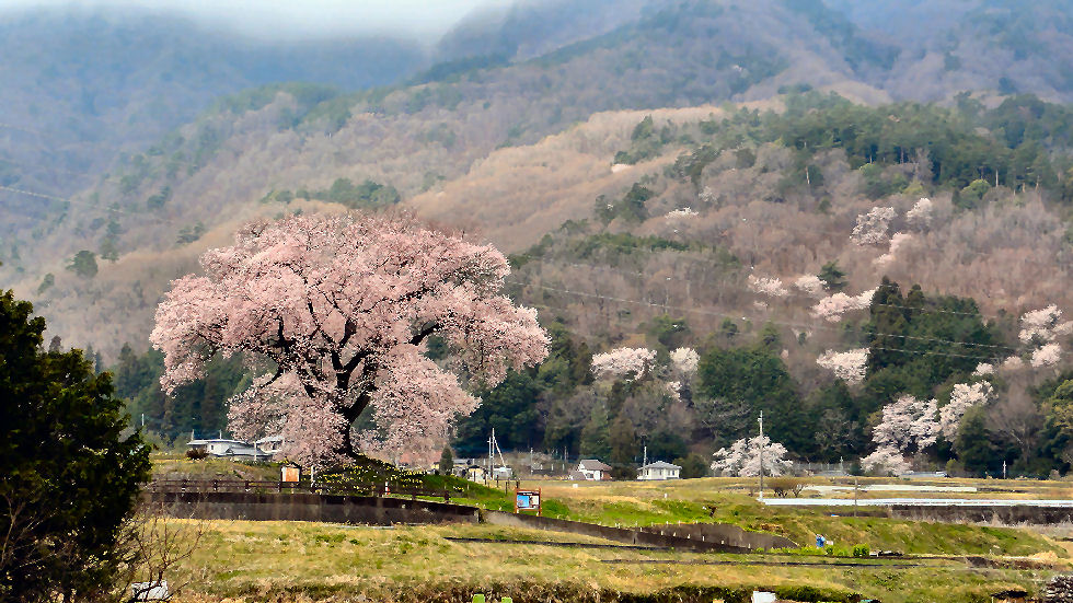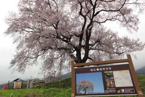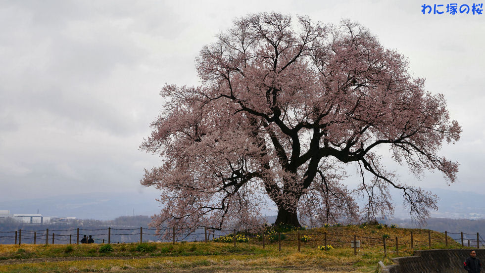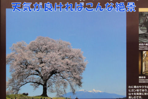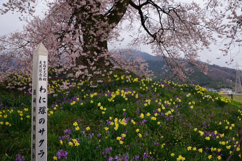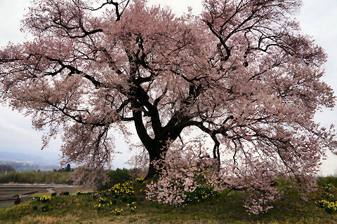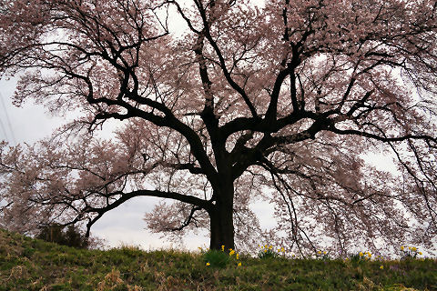 韮崎駅前8時33分発のバスに乗る為、5時の始発電車で出発、横浜・東神奈川・八王子で乗り換えて韮崎駅には 8時28分到着。バスを降りて歩く事15分程でわに塚の桜へ到着、曇り空で人は少なめ。 |