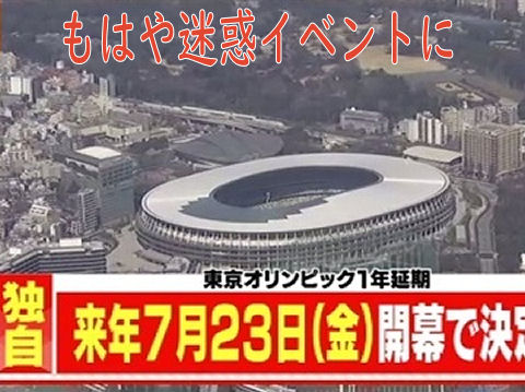 急遽延期となった東京オリンピック、急いで日程を決めたようだが今年も他のイベントを押しのけて会場を確保した のに来年も押しのけるというのは迷惑イベントでしかない。何でもオリンピックのためなら許される訳もなく。 |