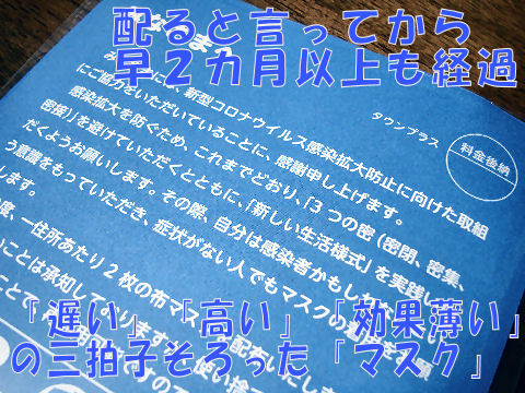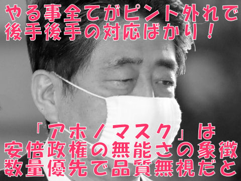 大げさに全国民に配布と言ってから早2カ月以上経過、今更感の強い役立たなそうなマスク。まさにアベ政権を象徴するようなマスクで466億円の盛大な無駄使い、「無能な政権」がコロナ抑制に効果の大皮肉。 |