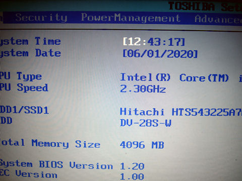 組立後に温度チェックすると10℃位は下がったのだがファンが完全に回っているとは思えない。ファンではなくドライブ回路の故障なのかもしれないので交換用のファンの入手は中止、久しぶりのPC分解だった。 BIOSはもう東芝オリジナルでない、アダプタ電源電圧が15Vだけは前のままだが。 |