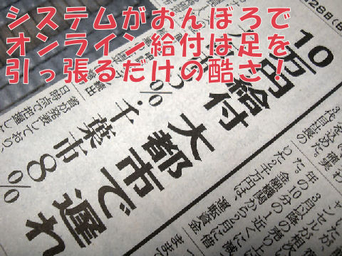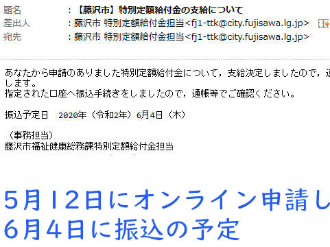 申請受付から24日目の支給予定となったが、ポンコツオンラインでITのかけらもないようなシステムなので市役所は大迷惑だったと思われる。要は電子FAX機能しか無く記入間違いや添付漏れもノーチェックで通すというお粗末だった(その後一部は改善)。 |