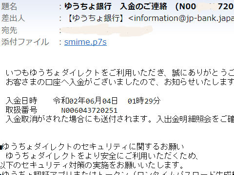 ゆうちょ銀行から入金の通知が来たが、ゆうちょからの入金通知は初めて。他からの入金通知はを配信しないのは何故?申請時にメルアドを登録したがゆうちょにも流れているということ? |