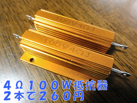 公称100W(実際はそんなに消費できない)4Ωを2本注文、2本繋げれば8Ωでアンプの負荷抵抗に最適、電源の負荷テストにも利用できる。このままでは放熱上無理があるので厚いアルミ板に付けて端子台を設けて使う予定。 |