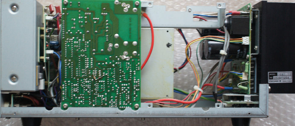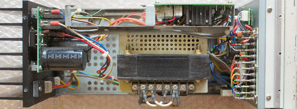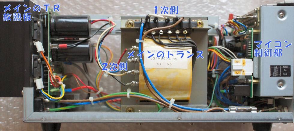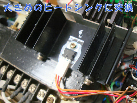 そこでマイカシートを挟んでヒートシンクに絶縁して取り付け、でも大きいので入れる場所に一苦労、基板とトランスの隙間へ押し込み電解コンの頭へケミカルスポンジを付けて押さえて固定。もう少し定常的な固定法を考える必要あり、ヒートシンクは充分大きいので熱での故障はないだろうが。この電源はマイコン制御の高級品で新品価格18−9万円と超高価でアマチュアが買えるものではない。 |
