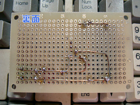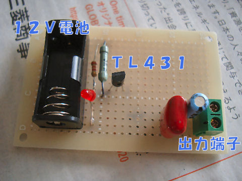 秋月で買った小型蛇の目基板を使う、大した回路でもないのですぐ完成、出来ないのはやる気の無さだけ。とりあえずREF端子は電源側に繋いだので2.495Vが出力端子に出てくるはず。精度の良い抵抗で分圧すれば2倍の電圧も出せるのでスペースは確保済。 |