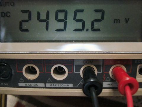 表示は2495.2mVとなりほぼ定格通りの値を表示、これが絶対値として正確かどうかは別としてもTL431の精度範囲には入ってているという事。 仕様では2440−2550mV、代表値は2495mVである。 |