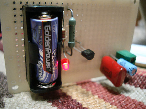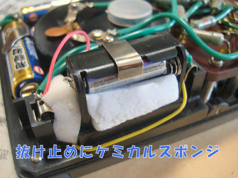 そのままでは固定できないので一緒に買った単5電池2個用ホルダにいれて配線をして使用。やや小さいのと電池ボックスの端子が接触しないよう隙間にケミカルスポンジを詰めて抑える。電圧がやや高め(元22.5V>24V)だが調整用VRもあるので問題なし。 |