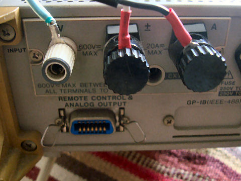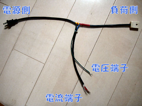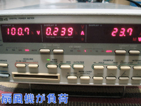AC100Vで仮配線は危険なのできちんとした計測用ケーブルを作成した。 さっそく扇風機を負荷にして電力測定、0.1W単位まで表示できるので小負荷でも測定可能。 |