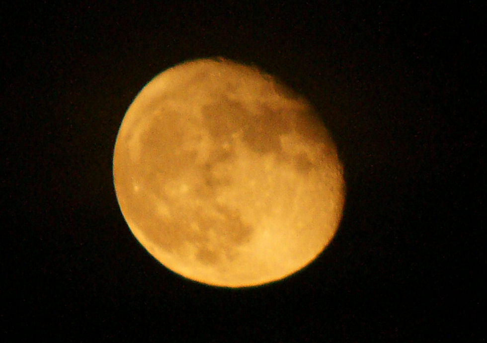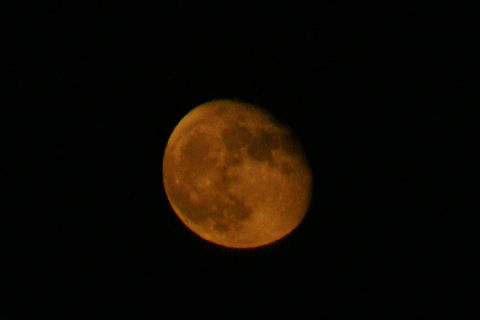 水蒸気の多い低い位置の月が赤く見えるという「ストロベリー・ムーン」、水蒸気でピントもシャープではない。 気象庁のホームペイジによると左上に小さく見えたのは土星らしい。 |