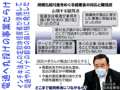 給付金事業を直接受注せず実体のない幽霊法人を経由して受注、ほぼ丸投げで電通へ、さらに2次、3次の下請けへ流してさやを稼ぐという電通の商法は税金を中抜きしているのと同じ。こんな怪しい法人へ発注する経産省は完全な馴れあいで天下り先への還流も? |
