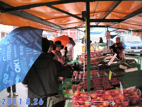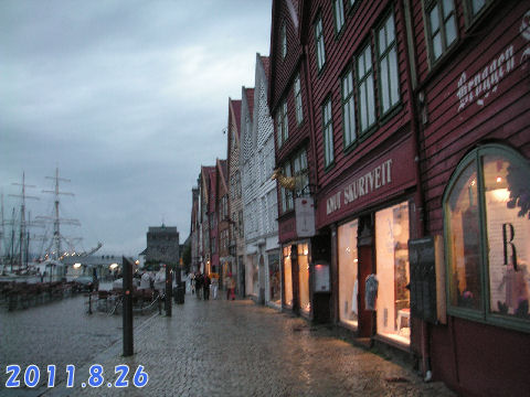 ベルゲンは中世から鱈の水揚げ・加工で賑わい多くの商人が集まった街、昔の木造の家が港沿いに多く残っている。中には傾いた家もあるが歪んだ形のドアに交換して使っている。 街頭の市場には魚や果物も多く有り興味深かった。 |