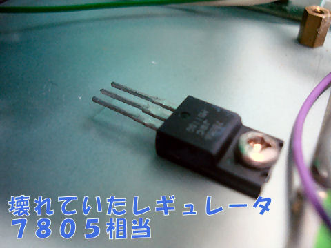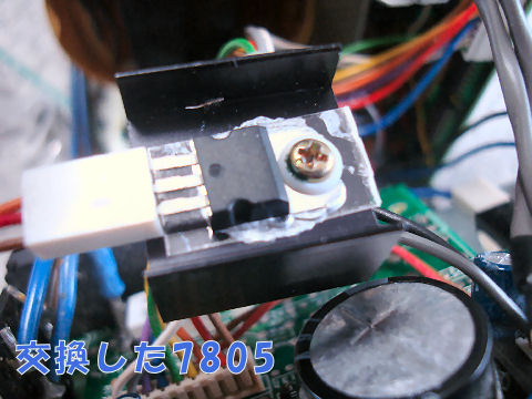 WEBの記事からマイコン用の5V電源を作っているレギュレータの故障だろうと踏んで、新しい7805相当品に交換したらパネルのLEDも点灯して大当たり。でも結構発熱するので元の位置へ取り付けようとしたが代品はプラモールドでないのでそのまま付かない。 |
