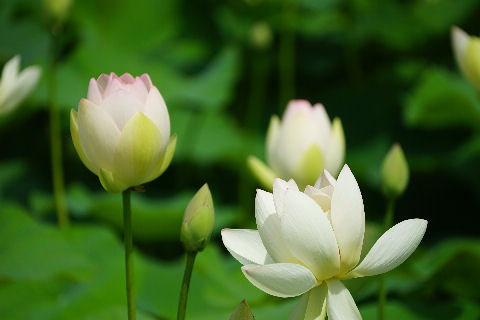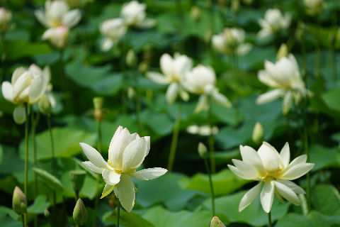 第一池はほぼ満開に近い、手前の第二蓮池はまだほとんど咲いていない。 |