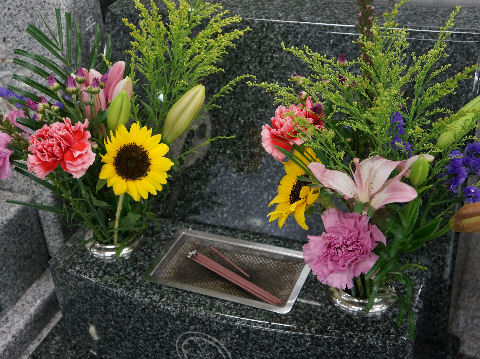 コロナ禍が続く中で墓参に来る人は減っているよう、花のある墓は少なくなった。 |