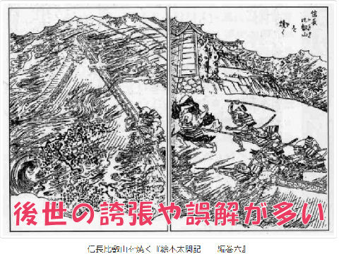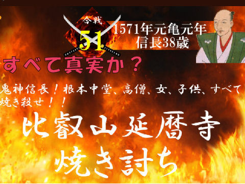 延暦寺は多くの荘園や坂本での琵琶湖交易から多くの利益を得ており、武装集団も有し度々政治にも干渉、戦国大名と何も変わらない存在だった。 焼き討ちした理由は延暦寺が織田信長と敵対関係にあった浅井・朝倉家と密接な関係があったことと、僧侶の堕落と僧兵の廃絶が狙いだった。 寺の実態は麓の坂本へ移り焼き討ち以前に廃絶していたものが大半、信長による比叡山延暦寺焼き討ちによって実際に焼失したのは根本中堂と大講堂のみであると判明。数千人が殺害されたとするも人骨なども出土せず。 |