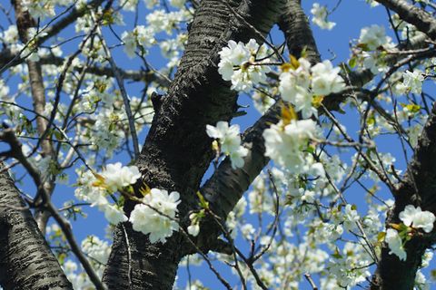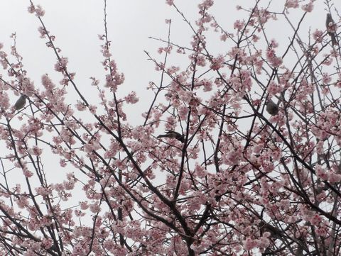 まだ咲いている花が少ない季節、桜の花に群がっている椋鳥、ぎゃーぎゃーと鳴き声は五月蠅く風情はない。 |