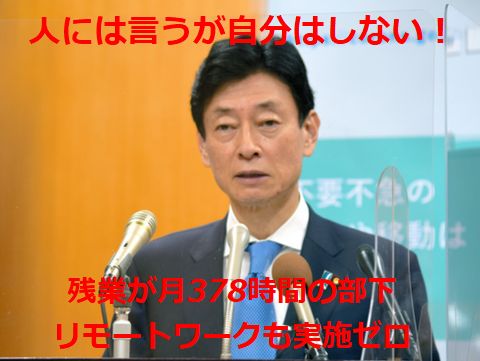 国民には指示ばかりするのに自分たちは何も出来ていない事が露見した西村再生大臣、何も知らない無能大臣のため膨大な残業を強いている? リモートワークも言い訳できない、と言ったが自身はゼロというお粗末。 |
