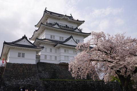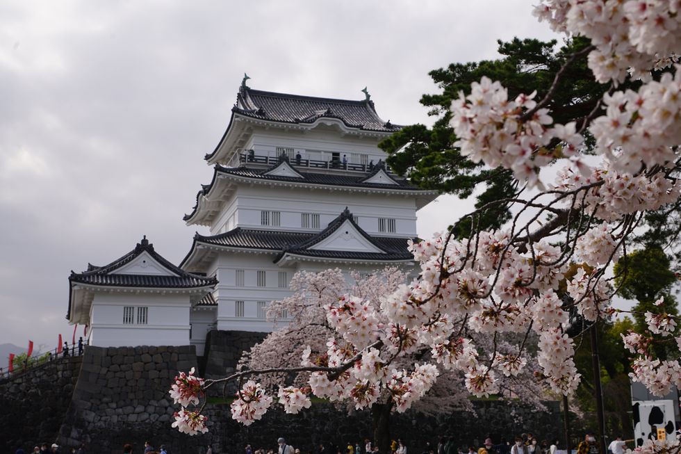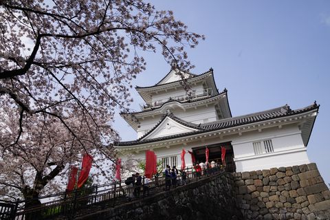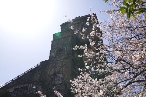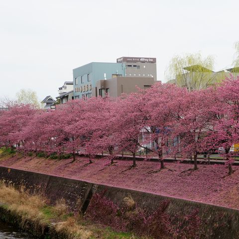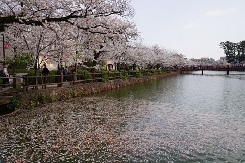 ![]() 掛川城を見通す桜 逆川沿いに咲く桜の並木、掛川桜という品種だそう、花弁が土手に落ちてピンク色に。 |