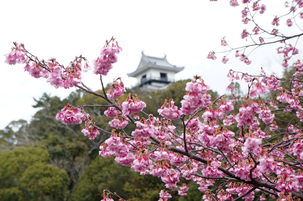 お城の下の川沿いで200本はあるという掛川桜という品種、花の色が濃い。 |