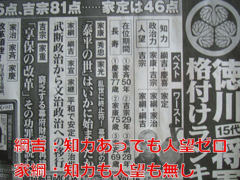 これを見ると知力に優れた綱吉は人望がゼロ、方針をきちんと理解し実行できる取巻きがおらず阿呆ばかりだった? 家綱って誰と思ったら三代将軍・家光のあとの将軍、前半は実力者の老中がいて大丈夫だったが、後半は放漫財政で徳川幕府崩壊の始まりだったよう。 |