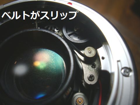 開放検知のスイッチの絶縁で絞り優先では使えるとの記事を見つけ、マウント側から開けてみた。駆動用のプーリへ動力伝達するベルトが伸びてスリップが原因かも、治らず。 |