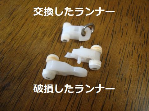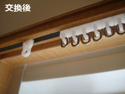 和室のカーテンランナーが光劣化?のせいか釣り穴部分が割れて使用不能に、一つ置きにするなどで暫定対策してきたが、4つも割れてしまったので交換実施。使ってないレールからランナーを取りだし左側へ入れた。一体型は捻りに弱いのか? |