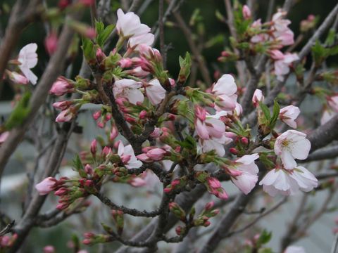 小学校の庭にある桜、道路へ出ていた枝がばっさり切られて寂しい状態だが、やっと咲き始めて半分位。こちらはソメイヨシノのようで花がピンクっぽい色、咲くのは遅め。 |