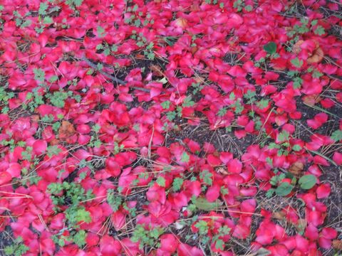 公園沿いの道路、椿の花が散って赤い絨毯になっていた。 |