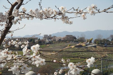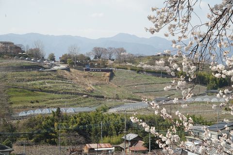 神代桜は大きな幹は折れて無いが両脇の枝が結構立派、老木で手入れが大変のよう。ちょうど維持のための3次元画像の撮影をしていた。帰路もバスで韮崎へ、途中で新府城の裏側の真下を通った、高い断崖の台地(七里岩)が続き、上には東京エレクトロンの工場もある。 |