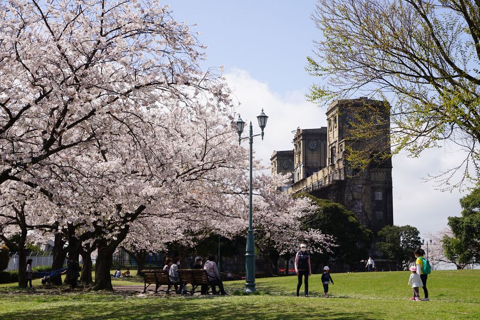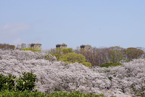 根岸駅からバスで丘の上の公園へ、桜が満開。桜の山の向こうに一等馬見所の廃墟の先端部が見えている、その右手にはランドマークタワーも見える。 |