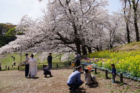 桜はもうどこでもほぼ満開になっている、フリージアも綺麗に咲いている。 |