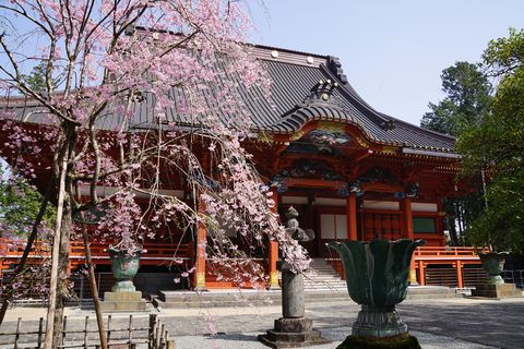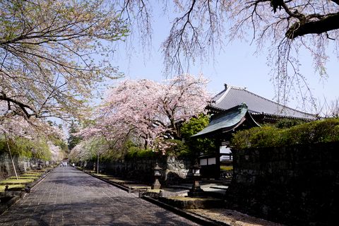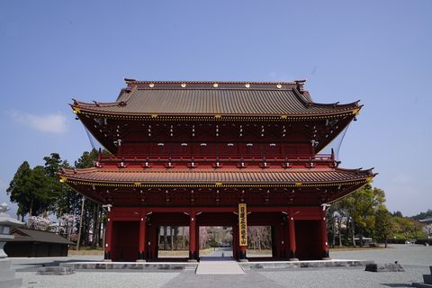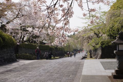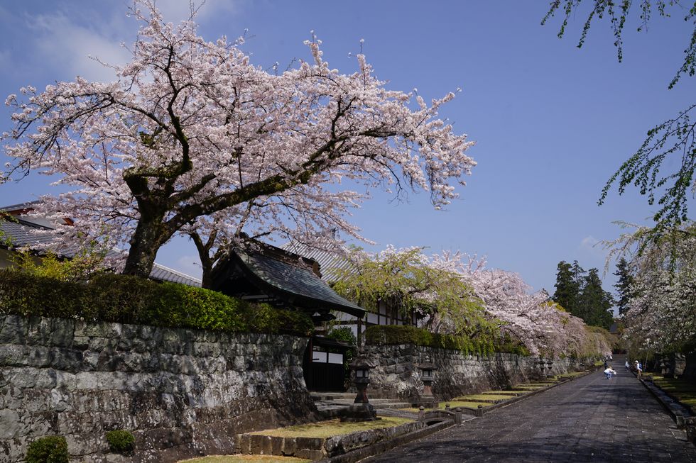バスは一日数本、それでも東京や新富士駅から直通バスの便もある大寺院。三門から北へ延びる通路の左右には宿坊が並び桜の間を抜けてゆく。 |