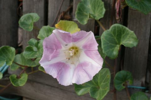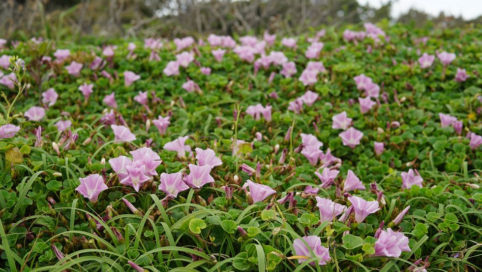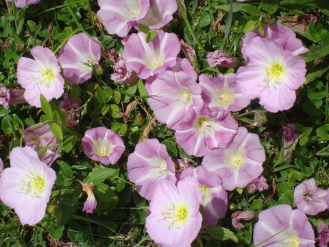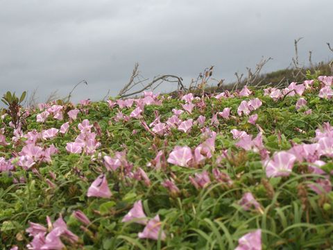 海岸に多いハマヒルガオだが歩道の周辺にも進出し、ヒルガオに混じって咲いている。 |