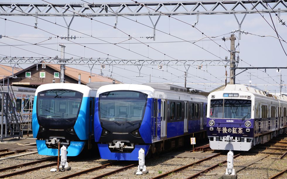 長沼駅で降りて踏切を渡り、車庫のA3000系を撮影、シルバー・赤・青・紫の4本がいた。横には1000系が2本見える、ちびまるこ電車は今日は運航中で見かけたが撮影できず。 |