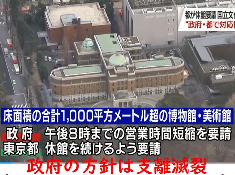 文化庁は都の休業方針に反し5つの施設の再開を計画、都の休業要請に「論拠を示せ」と反論。「映画館」は休業だが「演劇ホール」は開催OKという「論拠不明」の根源は国の方針、「論拠を示せ」とは「よく言うよ」としか言えないお粗末さ。 |