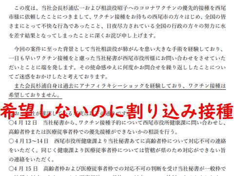 最初は否定していたが報道で広まると一応は謝罪のメッセージ、内容は国会議員のごとく「秘書が慮った・・」と秘書のせいにする内容。会長は希望してないと言いながら会場へ向かっていたと伝えられると「付き添いだった」と言い訳、いい年の大人が接種に付き添い? スギ薬局の社長(今はスギHD会長)もカンブリア宮殿に成功者として出演し盛んに自慢していたのだが、この「上級国民感覚」には大いにがっかり。 |