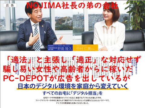 *ジマもテレビの「カンブリア宮殿」で丁寧な対応を売りだと自慢していたが、エアコン工事費をちょろまかし、不正の指摘にも言い逃れる、顧客窓口も逃げ回るという信じがたい上場会社。 PCデポは「女性や高齢者への丁寧な説明」を同様に売り物にしていたが騙しやすい高齢者をカモにしていた事が発覚、「適法」な取引だと言い張ったが「適正」でない対応で大非難を受け株価も評判も大幅下落した会社。 |