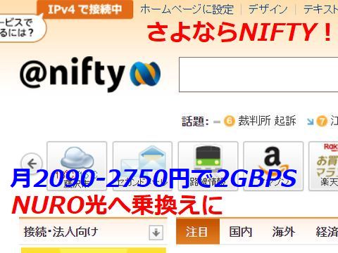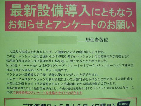 今利用中のADSLが9月でサービス終了、NIFTYからはフレッツ光への乗り換えを勧める連絡が繰り返し来るが料金が高く無視。待望のNUROのマンション向けが設備工事開始が決定、申し込みの受付が始まった。割引適用で毎月2750円以下、光なので最大2GBITの速度。現状はADSLで5MBITなので十分高速。 |