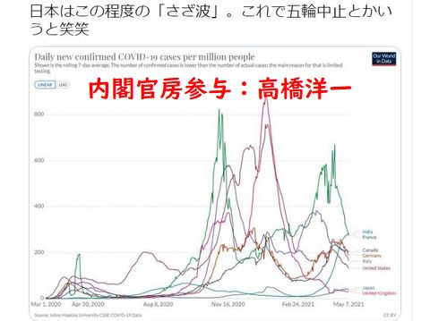 世界の最悪コロナ感染国を対比に持ち出し日本は大したことない「さざ波程度だ」と論評し非難を浴びた「内閣参与」、もっと対策の進んだ(成功した)国と比較すると日本の対策の失敗が露見するから?アメリカ陸上チームが事前合宿の中止を連絡してくる状況との大きな齟齬。 |