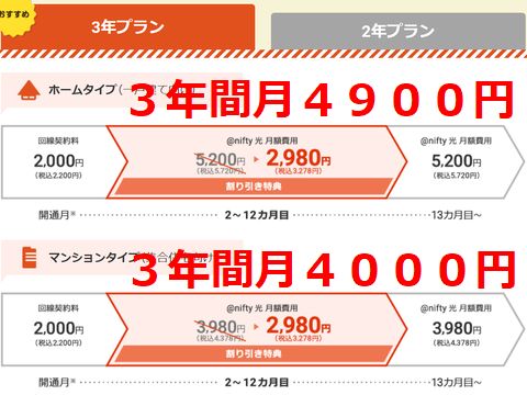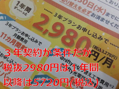 最初の1年間だけ月2980円(でも税抜き)、13月目以降は急激に高くなって1年間の安さは直ぐに幻になるという価格体系、これって誤魔化しに見える。高くなる料金はハガキには小さな字で解りにくく書いてある(下のサイトの説明は明快だが、見るとは限らない)、現行プロバイダからの変更は面倒なのでそのままにしたいという心理に付け込む? |