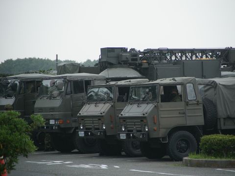 紫陽花が咲き始めてきれい、公園の駐車場には陸上自衛隊の車両がずらりと駐車していた。移動用のアンテナを載せた特殊車両と中型トラックの一団、移動の訓練? |