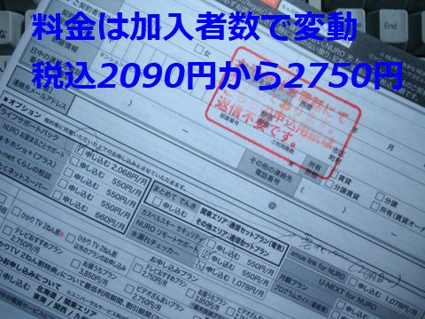 書類を送ってきた、申し込み自体は電話で完了なので確認のためのもの。毎月の料金は加入者数で変わるが2090円から2750円で税込みと格安、速度は最大2GBitとなっているが実際は300MBit位の様、これでも現状の60倍と大いに高速で文句なし。ずっと使うのので最初の1年だけ安いとかキャッシュバックの額では無く毎月の料金がポイント。 |