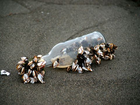 波の荒い日が続いたので海岸には海藻の他にもいろいろな物が打ち上げられている。海を漂う間に沢山の貝が付いた瓶やブイも砂浜に。時々は死んだ魚も上がるが、たちまちカラスやトビの餌になり瞬く間に骨だけになる。 |