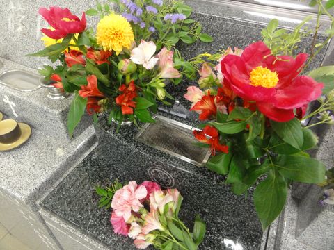 明日が母の命日だが、もう母の日も過ぎたのでカーネーションが大量にあるのではと期待したが、残念ながら残り少なかった。それでも3本づづにバラも入れて結構豪華になった。 |